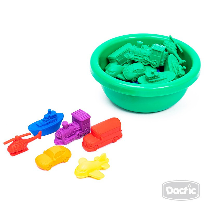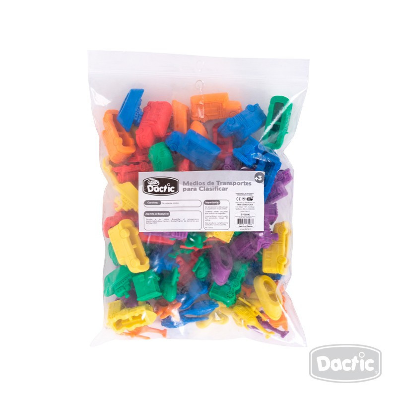 Set de figuras plásticas de medios de transporte. Permite desarrollar el razonamiento lógico-matemático mediante la clasificación de elementos por color u otros criterios. Contiene 72 piezas desde 3,3 x 1,7 x 1,5 y hasta 4,5 x 1,8 x 2,5 cm aproximadamente (Ancho x Largo x Alto). Recomendado para niños desde los 3 años.