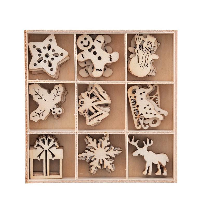 Ideal para manualidades, trabajos o decoración, El Set de figuras navideñas de madera contiene aproximadamente 5 unidades de 9 diseños distintos como: alces, trineos, regalos, muñecos de nieve, campanas, galletas de jengibre, estrellas, guirnaldas y cristales de hielo. 45 unidades de figuras en total para ocupar en el proyecto que tengas en mente. Producto no apropiado para menores de 3 años, ya que puede contener partes muy pequeñas. De ser necesario utilizar bajo supervisión de un adulto. El contenido viene dentro de caja de madera.