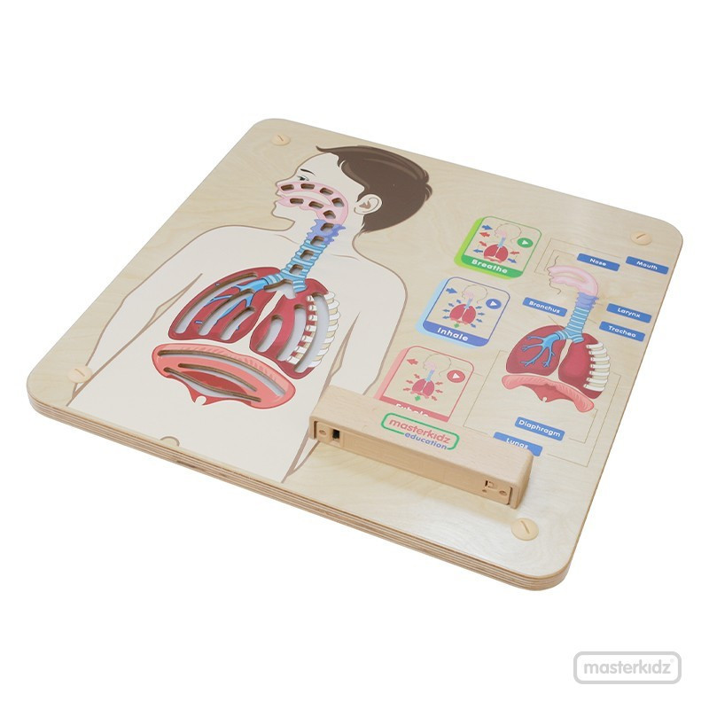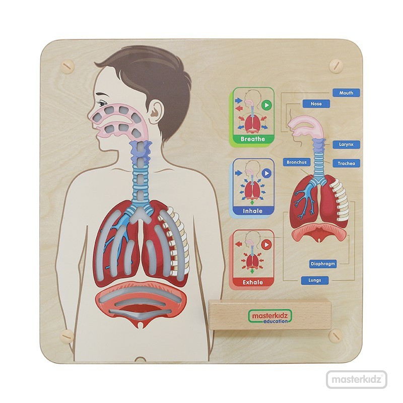 Con este entretenido tablero aprenderás que el sistema respiratorio es el conjunto de tejidos y órganos del cuerpo que nos permiten respirar. Conocerás también que los principales órganos del sistema respiratorio son la boca y la nariz, las vías respiratorias, los pulmones y el diafragma, todo esto de manera didáctica: cuando se presiona el botón "Inhalar", las cajas de luz se iluminarán y comenzarán a fluir para demostrar el proceso de inhalación: el diafragma se mueve hacia abajo, los pulmones se agrandan y el aire entra en el pulmón. Cuando se presiona el botón "Exhalar", el diafragma se mueve hacia arriba, los pulmones se vuelven más pequeños y el aire comienza a salir del cuerpo humano. El botón "Respirar" se utiliza para demostrar todo el proceso de respiración.