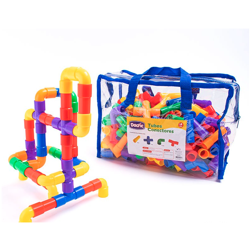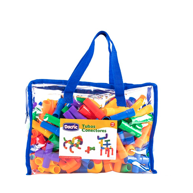 Set de 240 tubos conectores de hasta 6,7 x 6,9 cm. aprox. en colores rojo, amarillo, azul, verde, anaranjado y violeta que permiten crear innumerables construcciones. El uso de este material permitirá desarrollar la coordinación motriz fina, la capacidad creativa y el reconocimiento de formas y colores. Recomendado para niños desde los 4 años. ¡Incluye bolsa de PVC para guardar sus piezas! Material: Plástico no tóxico.