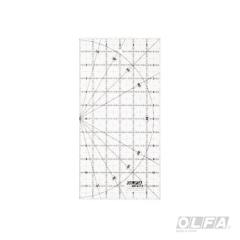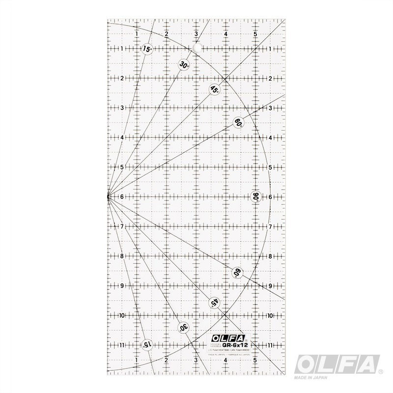 Regla acrílica rectangular de 6 x 12 pulgadas. Ideal para cortes de precisión en papel o tela, cuadrar esquinas y marcar en patchwork, quilt y fotografía. Incluye marcas de ángulos de giro. Material transparente y antideslizante .