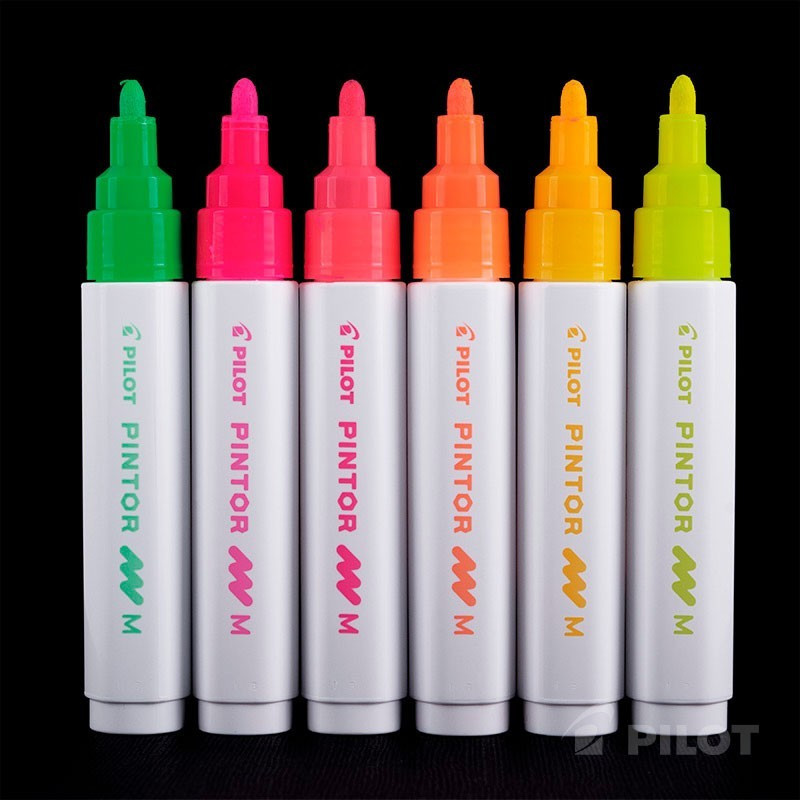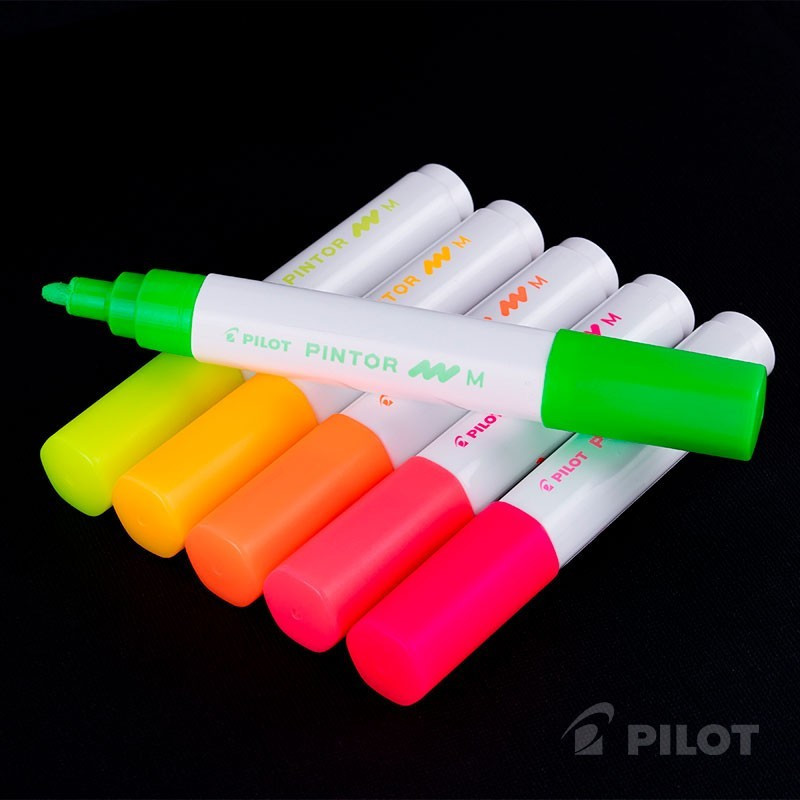 Nuevo Pintor Neón, de tinta pigmentada a base de agua. Reactivos bajo luz UV por lo que tus prendas blancas brillaran con estos intensos colores. Con los Pilot Pintor puedes dibujar en todo tipo de superficies, incluso oscuras. Su tinta es permanente en superficies porosa como madera, papel, cartón, tela o piedras. En superficies lisas se recomienda fijar con un barniz transparente o bien sometiendo a altas temperaturas. Secado rápido, punta de 4.5 mm y trazo de 1.4 mm. Producto Desechable.