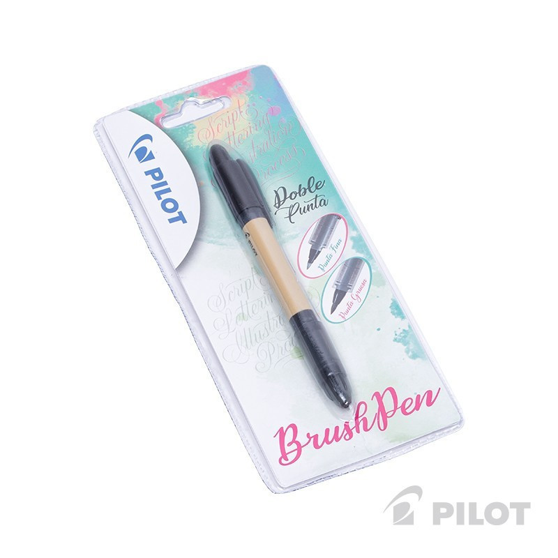 -Brush Pen Twin, doble punta: fina y media, color negro. Ideal para lettering, caligrafía e ilustración. Diseño tradicional japonés, dosificador de tinta V-Sistem, cuerpo y clip plástico. Ancho de trazo punta fina de 0,3 a 2 mm, punta media de 1 a 3 mm. Desechable.