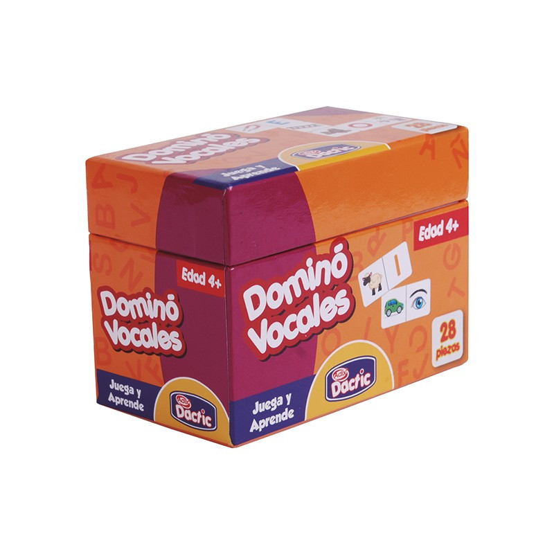 Juego dominó vocales de cartón. Permite al niño identificar el sonido inicial de las vocales asociándolas con la imágen correspondiente. Además de iniciarlos en actividades grupales con reglas. Recomendado para niños desde los 4 años.