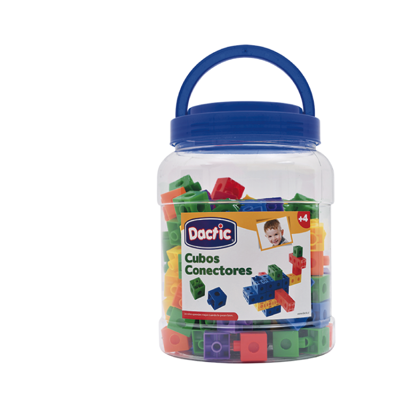 Set de 130 cubos conectores de 2,4 x 2cm. aprox. En colores rojo, amarillo, azul, verde, anaranjado y violeta. El uso de este material permitirá desarrollar la coordinación motriz fina, la capacidad creativa y el reconocimiento de colores. Recomendado para niños desde los 4 años. ¡Incluye pote contenedor para guardar sus piezas! Material: Plástico no tóxico.