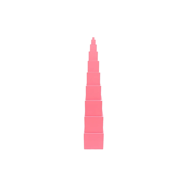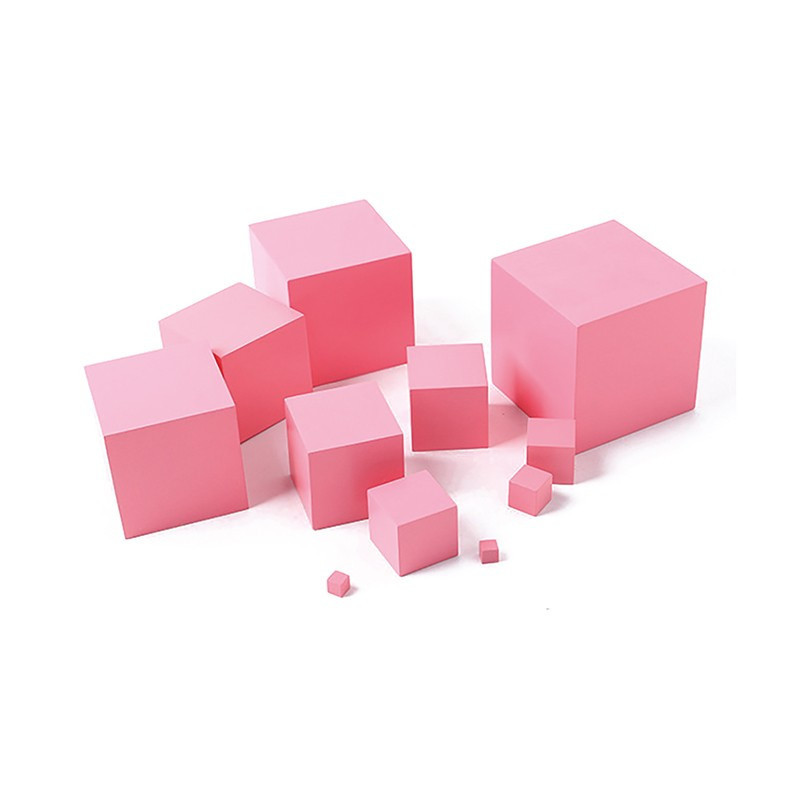 Set de diez cubos rosados de madera desde 1 cm³ a 10 cm³. Material clásico de la pedagogía Montessori y que permite al niño explorar y reconocer a través del tacto y la vista las diferencias de volumen y peso que existe entre los cubos. Pueden construir torres de acuerdo a su gusto y aprender los conceptos de más grande, más pequeño, encima, debajo, etc. Contiene 10 cubos rosados de madera. Recomendado para niños desde los 3 años.