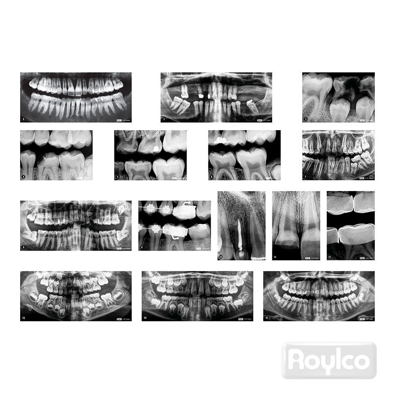 Set de radiografías dentales. Permite a los niños aprender de la salud bucal a través de la observación de radiografías de distintas lesiones dentales, el crecimiento de los dientes, su cuidado y tratamientos, además de aprender en el idioma inglés. También fortalece las habilidades sociales a través del juego de roles. Contiene 15 radiografías, una tabla de los dientes y guía de instrucciones. Recomendado para niños desde los 5 a 6 años.
