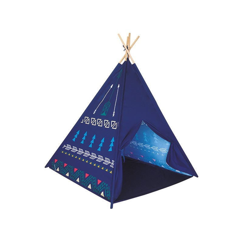 Carpa infantil con diseño indígena. Un pasatiempo ideal para desarrollar la creatividad, el juego grupal y las habilidades sociales. Contiene 1 pieza de tela 120x120x150 cm aproximadamente y 4 pilares de madera . Recomendada para niños desde los 3 años.